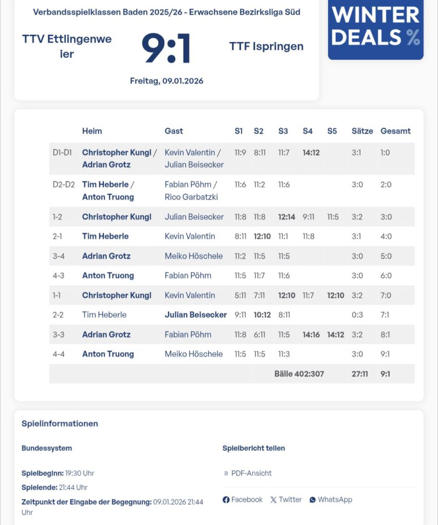 Unsere erste Mannschaft musste in Ettlingenweier eine deutliche 1:9-Auswärtsniederlage hinnehmen. Von Beginn an fand das Team nur schwer ins Spiel, viele Partien waren enger, als es das Endergebnis vermuten lässt, entschieden sich aber immer wieder zugunsten der Gastgeber. Diese profitierten in entscheidenden Momenten mehrfach von Netzrollern und Kantenbällen, was den ohnehin schwierigen Abend zusätzlich erschwerte. Den einzigen Zähler für unsere Farben konnte Julian Beisecker einfahren. Insgesamt blieb es ein gebrauchter Abend für unsere Männer. Nun gilt es, die Niederlage abzuhaken und den Fokus auf die kommenden Aufgaben zu legen.