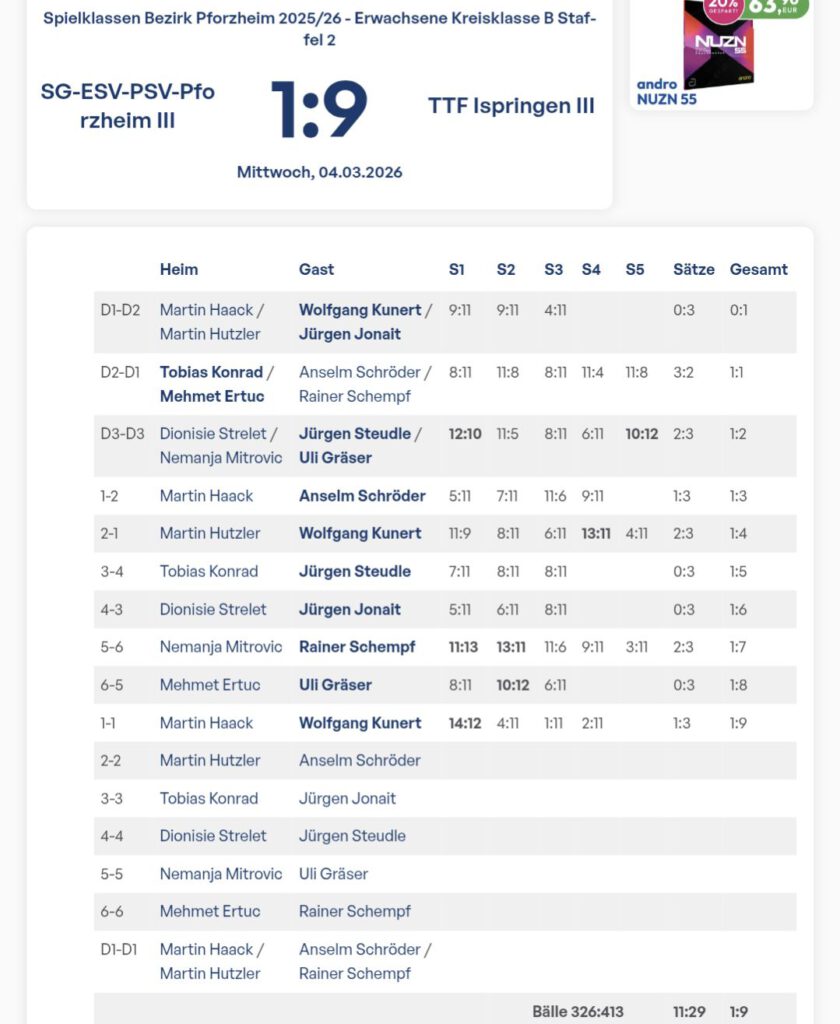 Unsere dritte Mannschaft bleibt weiter auf Erfolgskurs. Beim Auswärtsspiel gegen SG-ESV-PSV-Pforzheim III setzte sich das Team klar mit 9:1 durch. Nach einer starken Doppelphase und vielen überzeugenden Einzelleistungen ließ Ispringen den Gastgebern kaum Chancen. Mit dem deutlichen Sieg baut die Mannschaft ihre Tabellenführung weiter aus und bleibt damit klar auf Aufstiegskurs. Es spielten: Kunert, Schröder, Jonait, Steudle, Gräser, Schempf