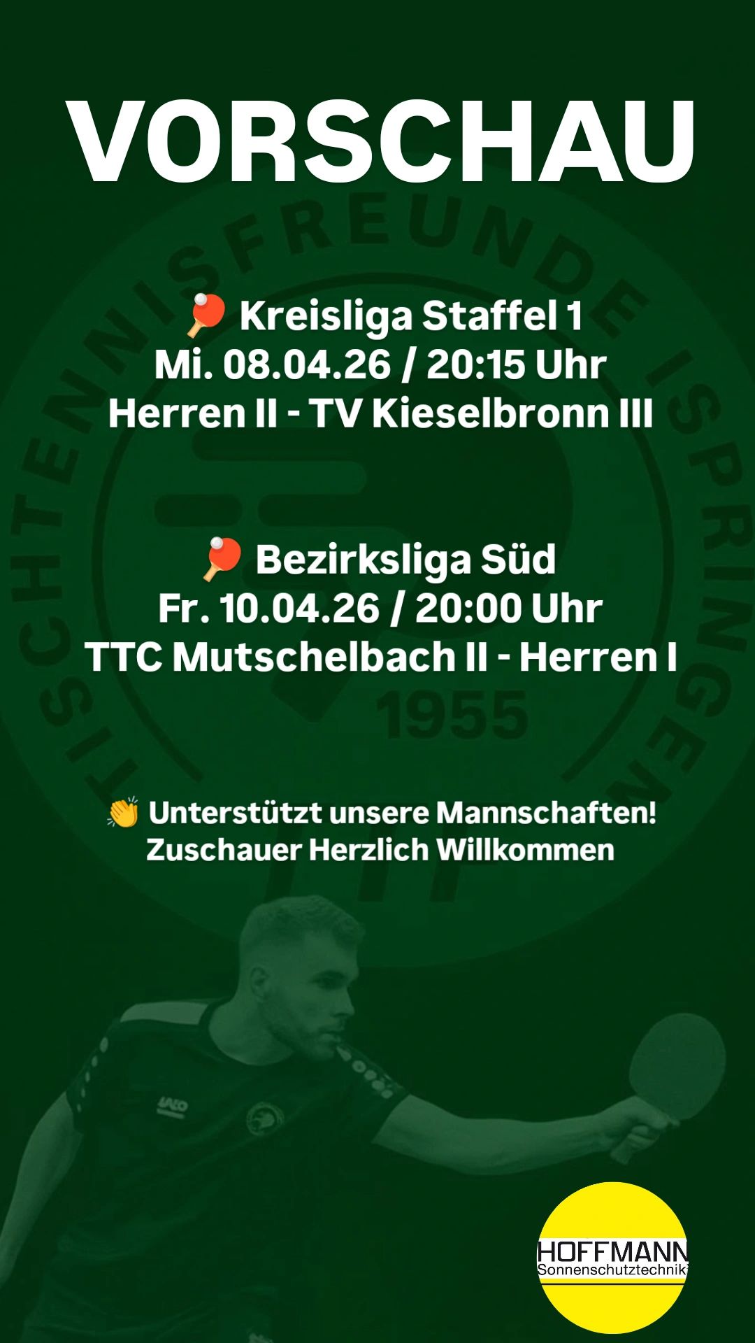 Am Mittwoch, 29. April 2026 findet die jährliche Generalversammlung des TTF 1955 Ispringen, bereits um 18 Uhr für die Jugend und um 18.30 Uhr für alle Mitglieder in der Kantine der Schulsporthalle Ispringen, Turnstr. 51 statt. Alle Mitglieder sind hierzu recht herzlich eingeladen. mehr…