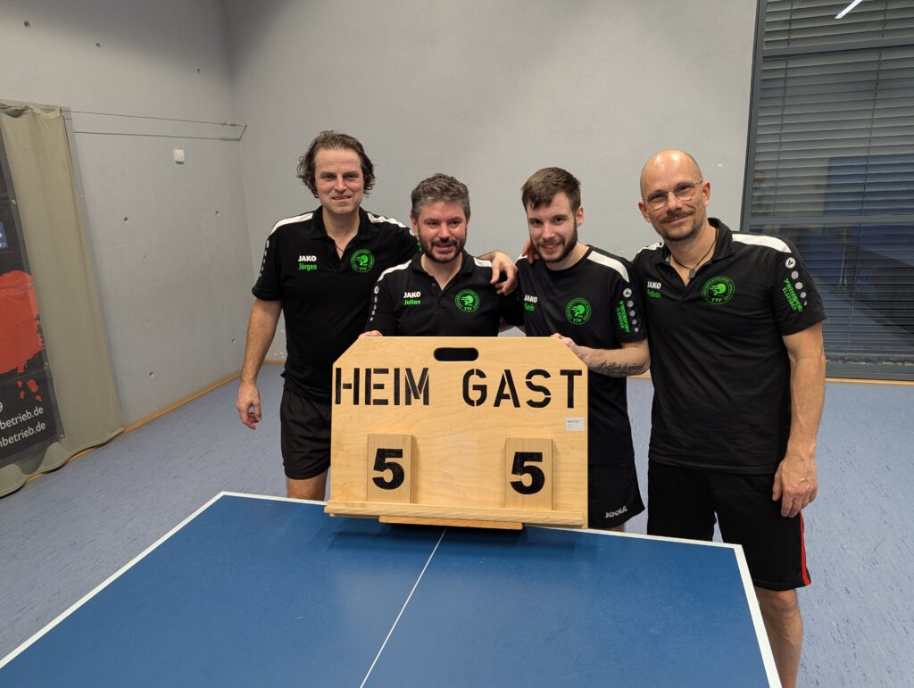 Mit einem leistungsgerechten 5:5-Unentschieden sicherte sich unsere erste Mannschaft in der Bezirksliga Süd einen wichtigen Zähler. Vor voller Halle und mit lautstarker Unterstützung zahlreicher Fans aus Ispringen entwickelte sich eine intensive und stimmungsvolle Begegnung. Sportlich überzeugten vor allem Julian und Jürgen mit jeweils zwei gewonnenen Einzeln. Kevin hatte im Einzel mehrfach Pech, zeigte aber im Doppel an der Seite von Julian eine starke Leistung. Fabian spielte engagiert mit, musste sich in seinen Einzeln jedoch geschlagen geben. Unterm Strich ein verdienter Punktgewinn in toller Atmosphäre.